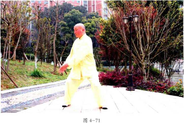 .力「| (向北,如图4-71 ):接上式,右弓步,右手臂侧立掌而前伸, 其手臂平肩,掌心向左。左手臂向右后而伸肘、伸腕,其手臂平扃,掌心向下。 不停,随呼吸,腰胯向右旋转,重心继续前移至右脚,左脚于后同时顺随腰胯 向右旋转,重心前移之势,而稍提膝、仲踝并上前一步,其足跟先着地,足尖 上翘而内勾,其膝并向后伸直。右脚于后即顺随其势而下屈,成左虚步。右手 臂干前伸同时顺随腰胯向右旋转,重心前移之势而向后屈肘,屈腕其小臂并稍 外旋,以至右掌立于左耳门前,其掌心向外。左手臂于后伸同时顺随其势,而 以肩关节为轴心,从左后斜下,经腰左伸肘并小臂内旋,即渐至其手臂斜垂于 腹前,其手掌轻贴于右胯,掌心向内。成左虚步,双手交叉之式。不停,随呼吸, 左虚步,腰胯向左旋转,重心并稍后下沉,左手臂于右腹下垂,同时顺随腰胯 左旋转之势,而以肩关节为轴心,稍屈肘,其小臂渐于右下向左上而外旋并斜 挥至额头之左外侧,其掌心向内,手指平于额头。右手臂向左上屈肘而至其掌 立于左耳门前,同时顺随其势而小臂渐内旋,并从左上向右下而伸肘,屈腕以 至其手臂下垂于腰右,其掌心向下。不停,腰胯继续左旋,重心稍前移向左脚, 并稍上拔而至其足前掌着地,左膝伸直,右脚于后随之向前伸膝,而至其足跟