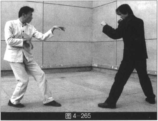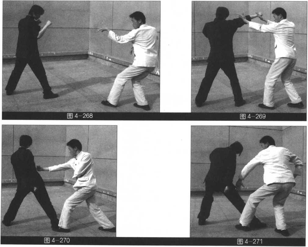 (我左势)左右手向右外侧拨压敌手臂,左脚向前踩进,随即以右手穿拳猛击敌人胸部要害 (图4-268?270)。此势可在打出穿拳以后,紧接左掌撩击敌人裆部(图4-271 )o此势为穿拳中 暗藏的一记杀招。往往令敌人难顾上下。