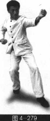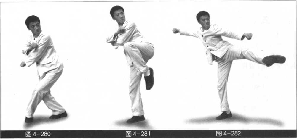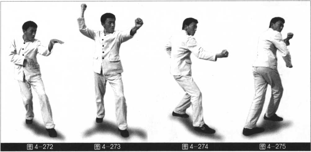 侧身站立,前脚虚点地,内扣15° ,膝内裹。后脚尖向前,膝内裹。前脚向前快速移动一 步,接着以头领身,身带步,后脚过前脚向前踩出3同时,左拳向左外侧化拨,右拳拳眼朝左, 向左侧横击,紧接后脚由前脚后向前插上一步,成倒插步。前脚提起,脚外侧发力向前蹬出。高 不过腰。承上势;落步后向前快速移动一步接着以头领身,身带步,后脚过前脚向前踩出3同时 右拳向右外侧化拨,左拳向右侧横击,紧接着后脚由前脚后向前插上一步,前脚快速提起脚外侧 发力向前蹬出,高不过腰(图4-272?282)。