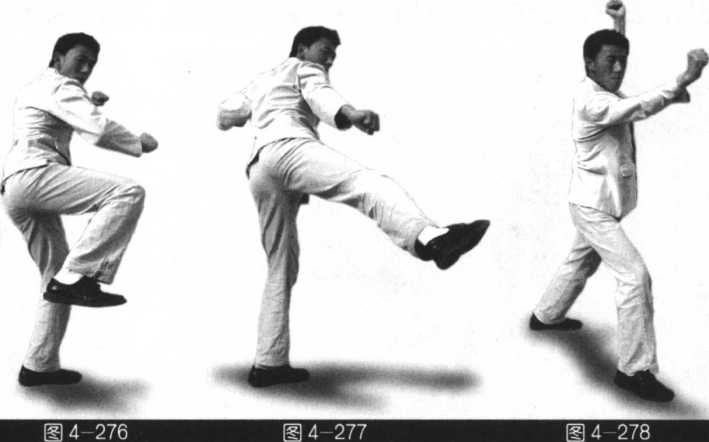 【动作要领】起腿蹬踢敌人,可用 后脚向前脚处滑动,然后起腿踢击;也 可用倒叉步踢击;也可原地踢击。以上 都应根据远近、方位、地理环境,酌情 而定,不可死守练习时每一技法的细枝 末节,需灵活运用。