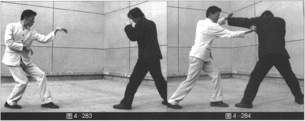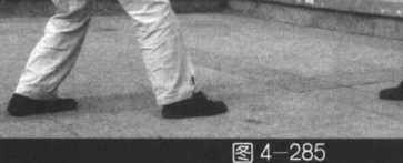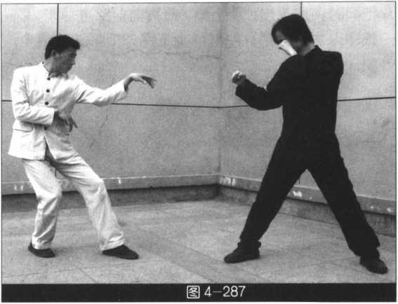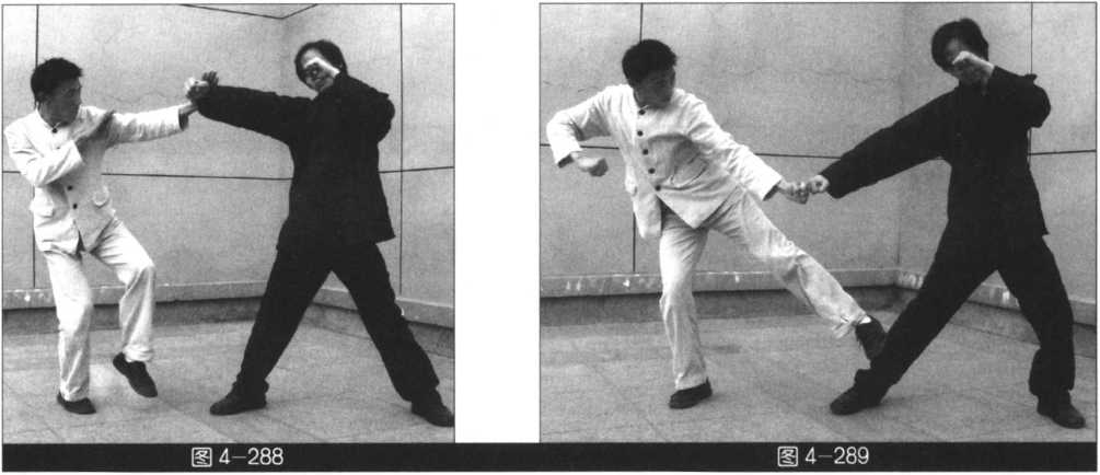 (我左势)左手向右拨其手臂,直 接起左脚猛蹬敌人小腿胫骨(图4- 287?289)。