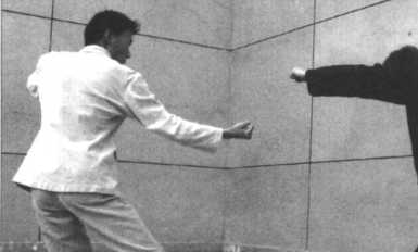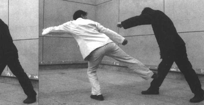 (我左势)左手外拨敌手臂,右脚过左脚,右拳横击敌人肋部,如敌人后撤,我即右脚蹬踢