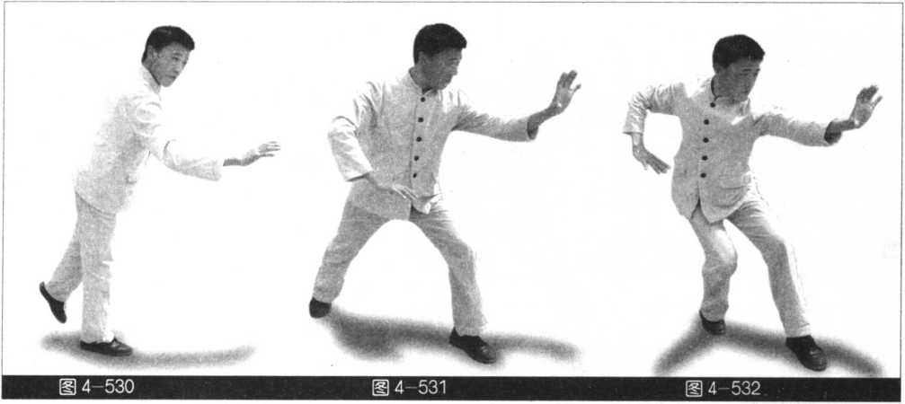 侧身站立,左脚虚点地内扣15° ,膝内裹,右脚尖向前,左手下按,以头领身身带步,右 脚过左脚向前踩出,同时右掌向前击出,左手回拉于左腰际。承上势,右手下按,以头领身身带 步,左脚过右脚向前踩出,同时左掌向前击出。右手回拉于腰际(图4-526~532)o