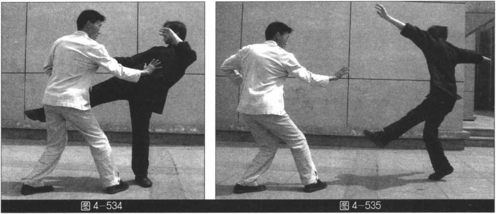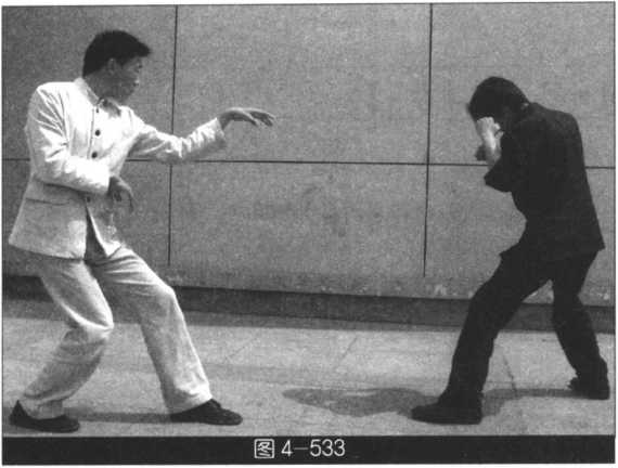(我左势)左手下按后拨拉敌小腿, 同时右脚过左脚向前踩出,右单把直击 敌人胸腹要害(图4-533?535)。