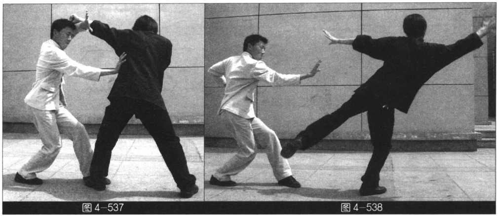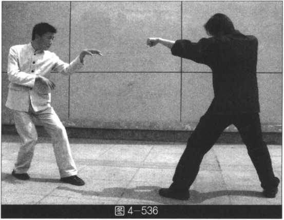 (我左势)左手向左拨敌手臂,同 时右脚过左脚向前踩出,右单把直击敌 人肋部(图4—536?538)。