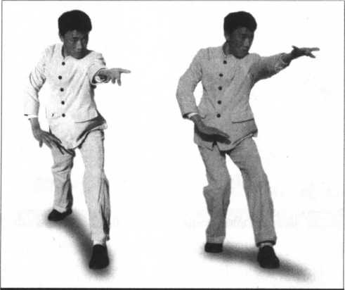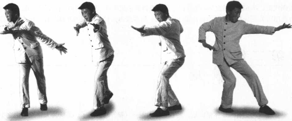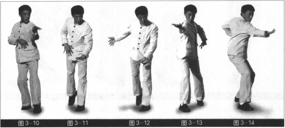 侧身站立,前脚内扣15°虚点地,前膝内裹,后脚尖向前,膝内裹重心在后。双手腕放松, 沉肩坠肘含胸拔背,顶劲竖项,接着移动重心向前,以头领身,身带步,后脚过前脚向前踩出, 内扣15°后脚随追半步,同时右手臂贴身向内侧旋转成搬把,手心朝前,左手手心朝下。上步 的同时右手臂向上撩起,左手回撤下按于腰侧。承上势,重心前移,以头领身,身带步,后脚过 前脚向前踩出,内扣15° ,后脚随追半步,同时,左手贴身向内侧旋转成搬把,手心朝前,右 手心朝下,上步的同时左手向上撩起,右手回撤下按于腰侧(图3-19?25)。
