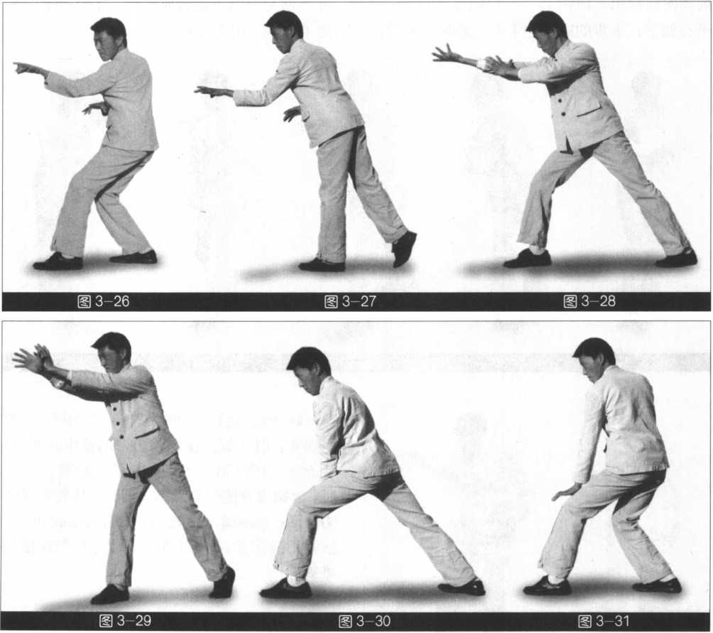 侧身站立前脚内扣15°虚点地,前膝内裹,后脚尖向前,膝内裹,重心在后。双腕放松,沉 肩坠肘,含胸拢背,顶劲竖项;接着移动重心向前,以头领身,身带步,后脚过前脚向前踩出, 内扣15°。右手臂借身催肩臂的劲力向前穿出,手心向上,大拇指有向右下拧翻之意,左手护 于右肘部3上动不停,左脚过右脚向前踩出内扣15° ,后脚随追半步成立中正之势。左手紧贴 右手背穿出下扑双手手心向下按于裆部(图3-26?31)。