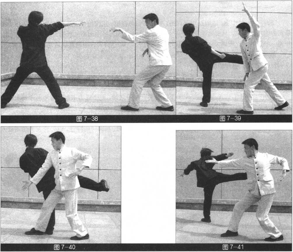 【动作要领】化解敌人攻来之拳,手脚粘粘相随,配合统一,上步时后脚蹬地猛然前扑,一 粘即发,整个动作在瞬间完成。