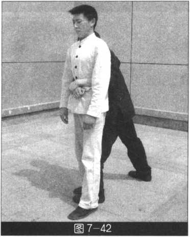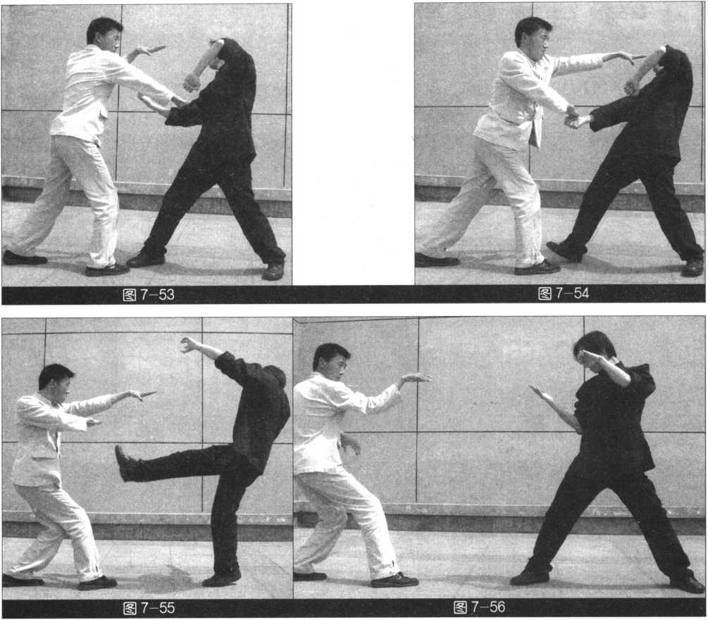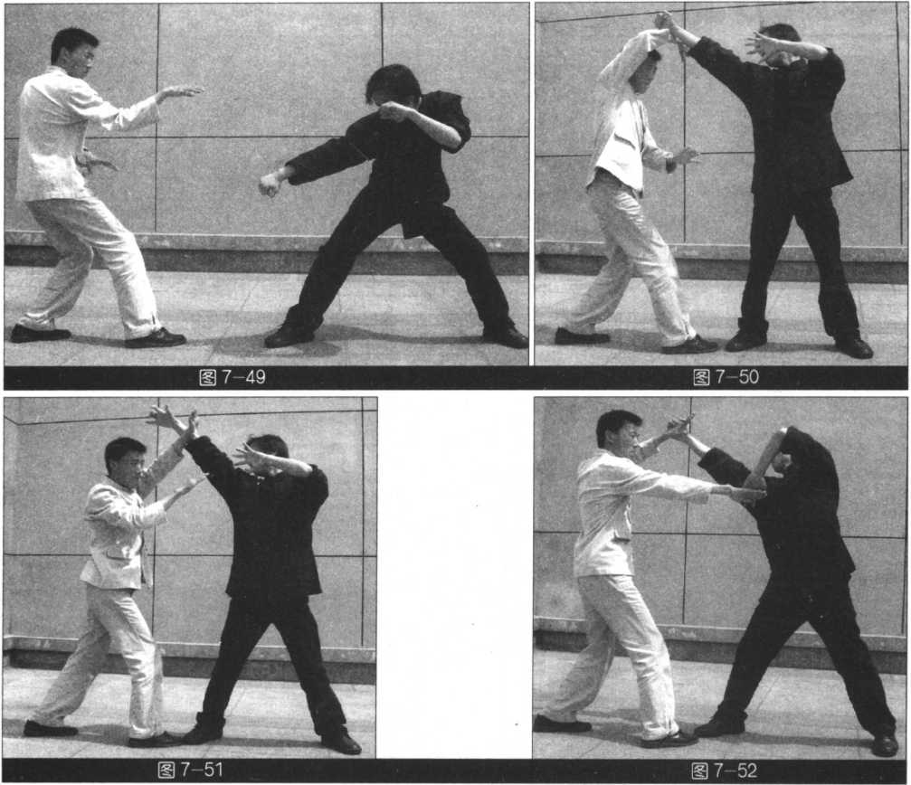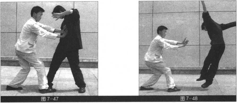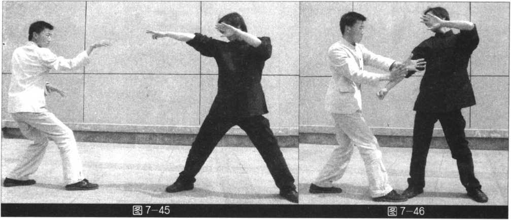 (我右势)双手向右外拨下压敌手臂,同时右脚向前踩进双把猛击敌胸部(图7-45?48)。