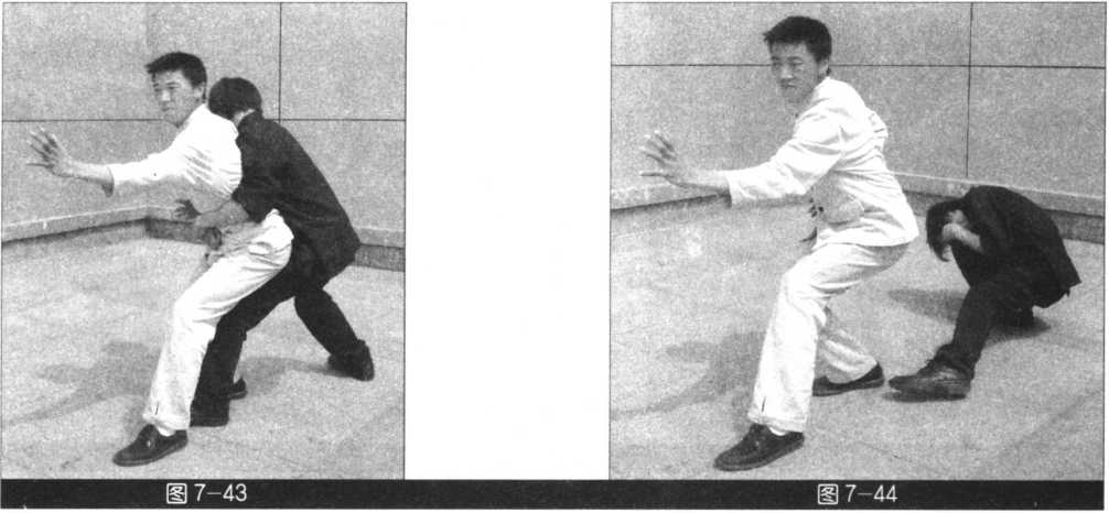 (我左势)右脚后撤,沉身下坐,以右股部发力撞击 敌人裆部(图7-42 ~ 44)。
