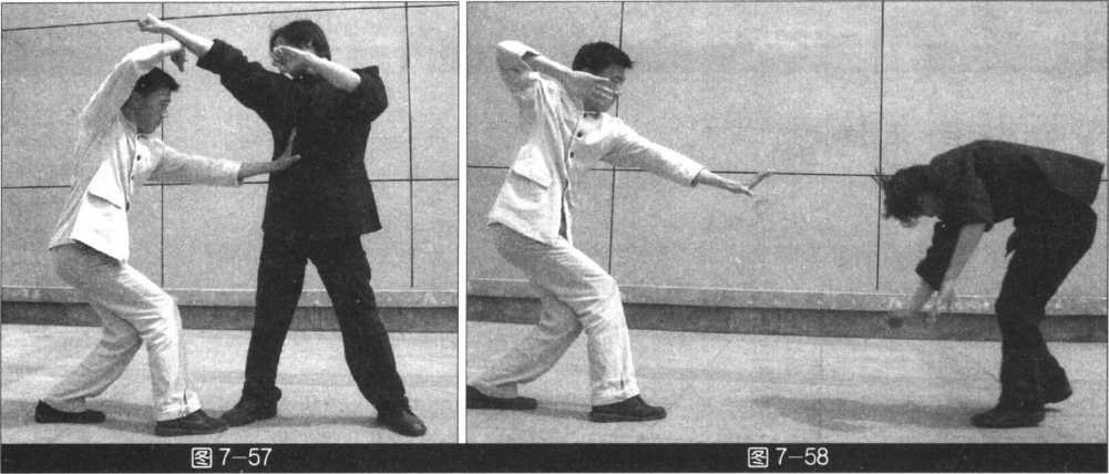 (我右势)右手向右侧外拨敌攻来之臂,左脚急进一步,左掌猛击敌肋部(图7-56-58)o