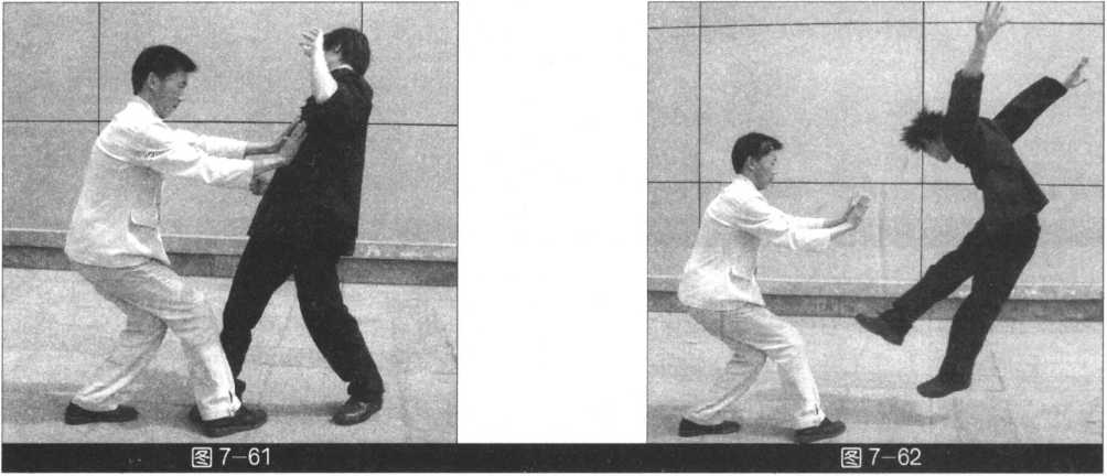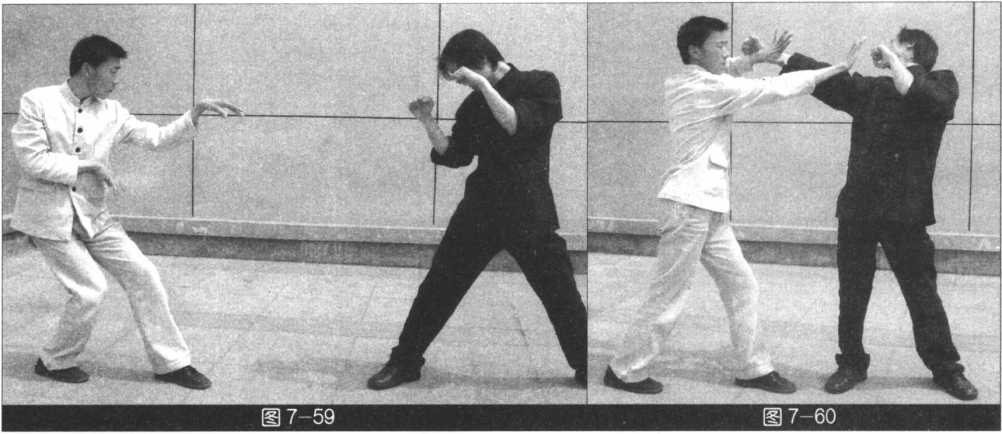 (我左势)左手向左外拨,右掌根发力猛击敌面部,紧接着右脚过左脚向前踩出,同时双把 猛击敌胸部(图7-59?62)。