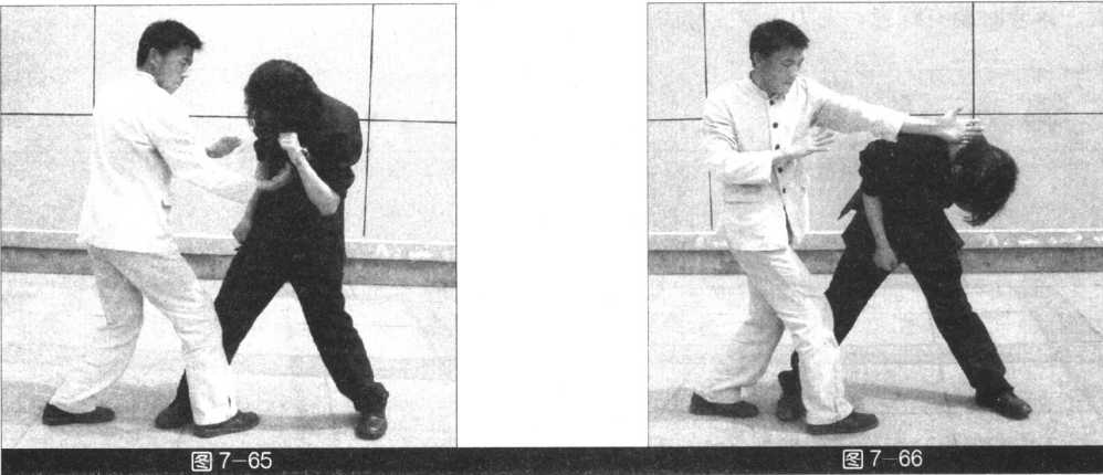 (我右势)右手向右外拨,同时右脚向前踩出,右拳猛击敌人当胸。紧接着左掌又斜劈敌人 颈部(图63?66)。
