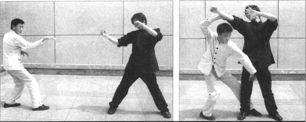 【动作要领】左右手与步法在瞬间完成动作,正所谓“闪即打,化即打,闪化即打。”