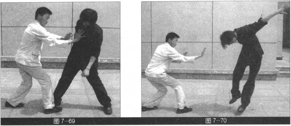 (我右势)右手向右外拨敌手臂,同时左脚过右脚向前踩落,顺势左手撩击敌人裆部。紧接 着右脚过左脚快速下踩,右手单把发力猛击敌人胸部(图7-67?70)。