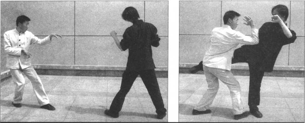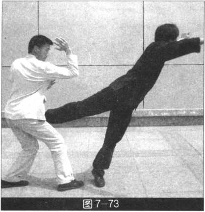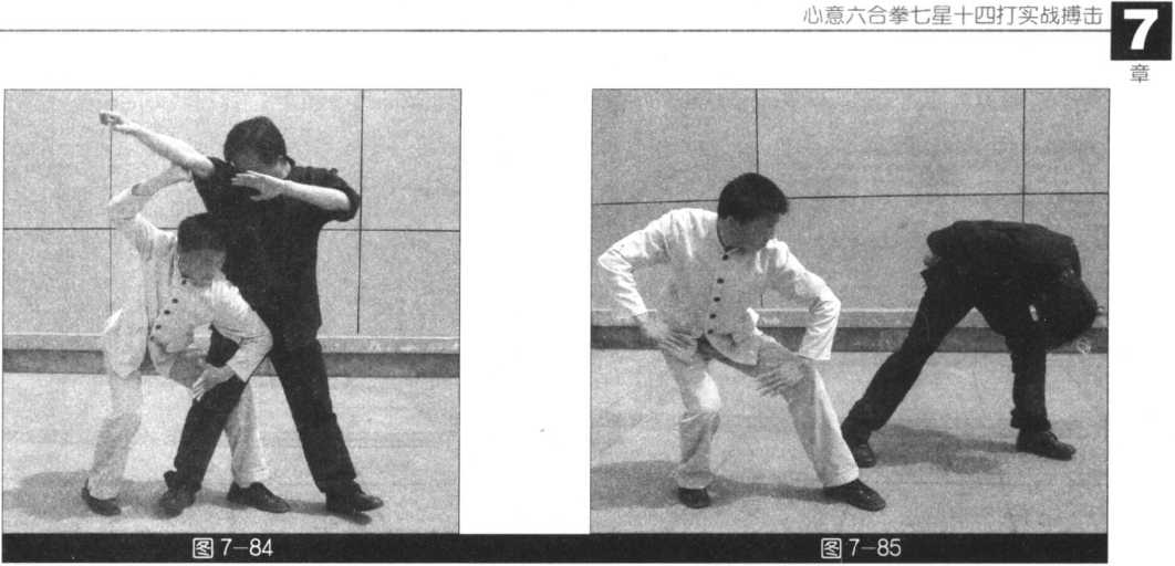 (我左势)左脚向前滑进一步,左手下按敌人大腿,同时右脚过左脚向前踩进,插入敌中门 裆部,右臂屈肘撞击敌胸腹部(图7-71?73)。