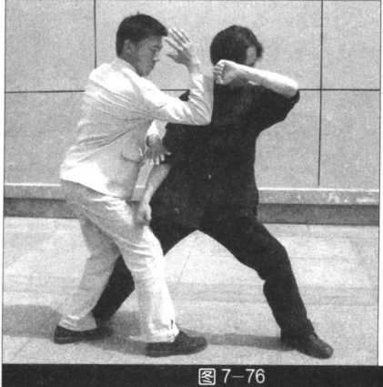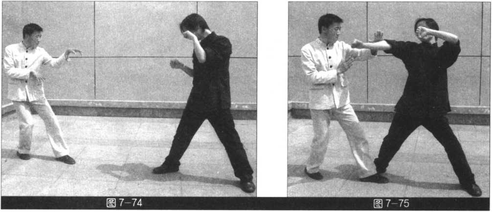 (我左势)左脚前滑一步,同时左手向右外划弧下 压敌大臂,紧接着右脚过左脚向前踩进一步,右臂屈肘 下砸敌胸部(图7-74?77)。