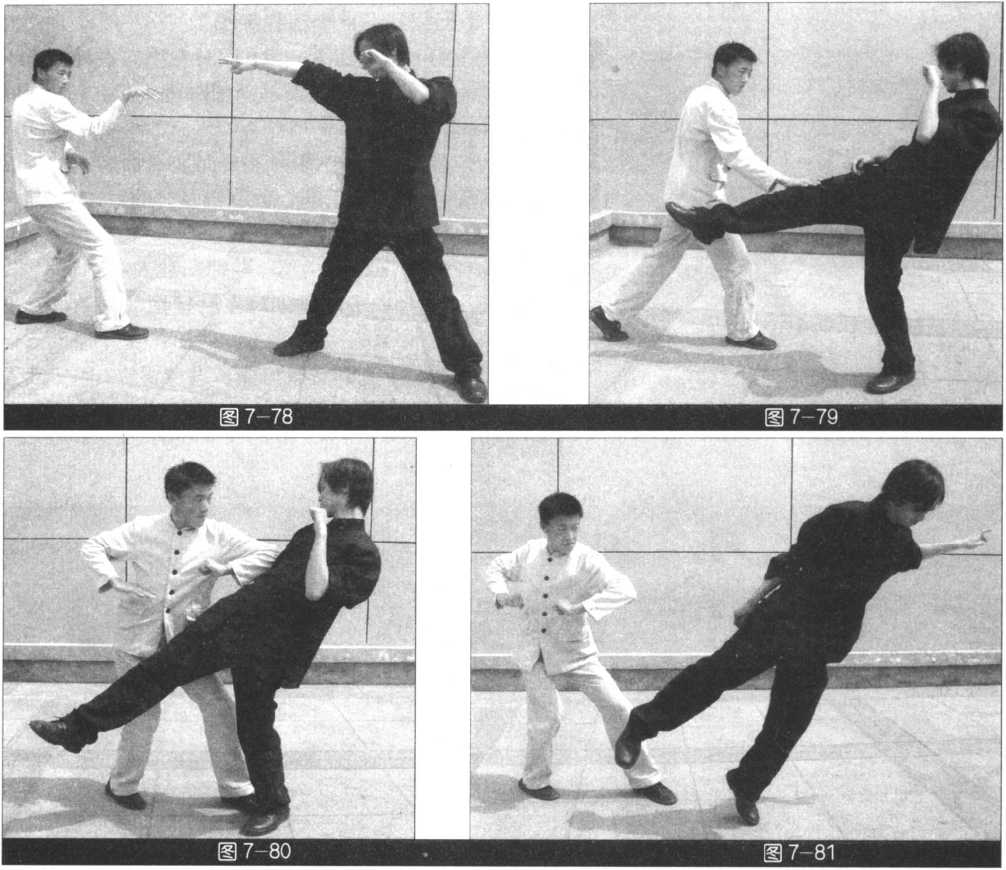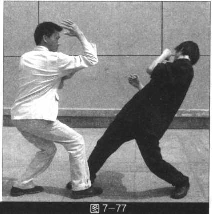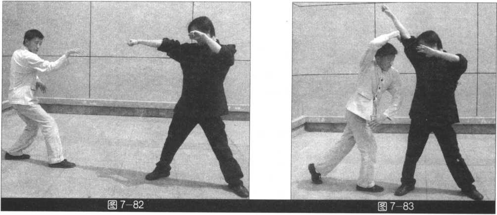 (我右势)右脚回撤半步,随即向敌人右侧斜上步, 左脚快速过右脚向前踩进同时左肘猛摆敌人肋部(图 7—78 ?81)。