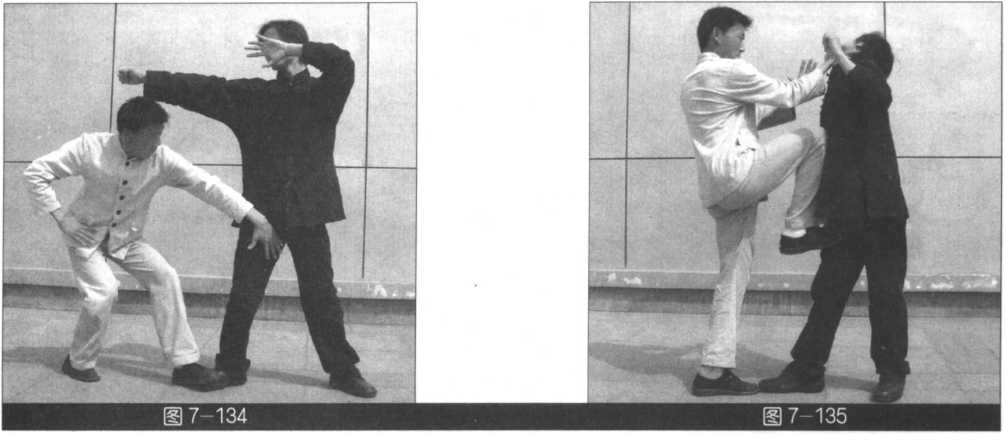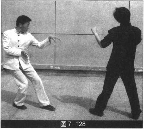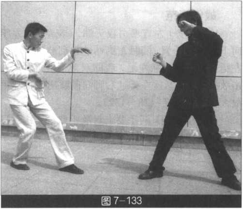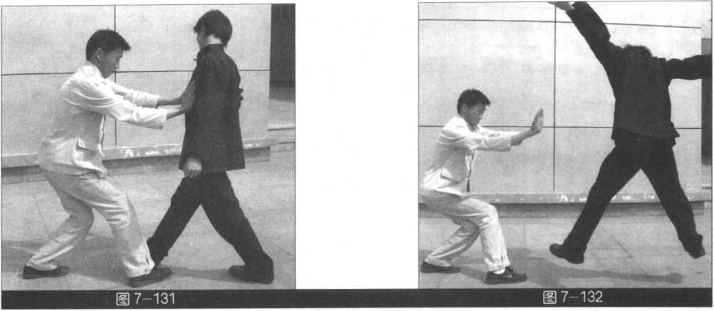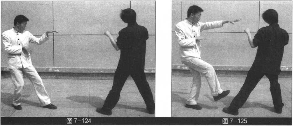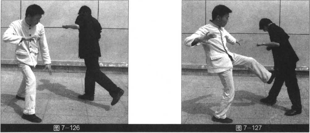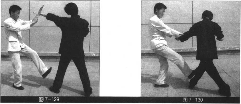 摇闪打是鸡步摇闪把中暗藏之腿法。其练法为左手向前斜搓,右手护于左肘处,同时左脚刮 地而起向前踩下,双手掌下按同时右脚过左脚向前踩下,手脚上下配合连环施以腿击。战例示范(敌左势)左直拳击我头部,(我左势)左手 向上斜搓敌手臂,同时左脚贴地起刮地风踩击敌 左腿胫骨。敌后撤左足,我即双手下按,右脚卷 击敌膝关节,紧接左脚过右脚向前踩出双把猛击 敌人胸腹(图7—128?132)。【动作要领】两手要上封敌手臂,晃住敌目 光,暗施腿技,连环紧逼不给敌人喘息之机。手 脚一致,上惊下取。