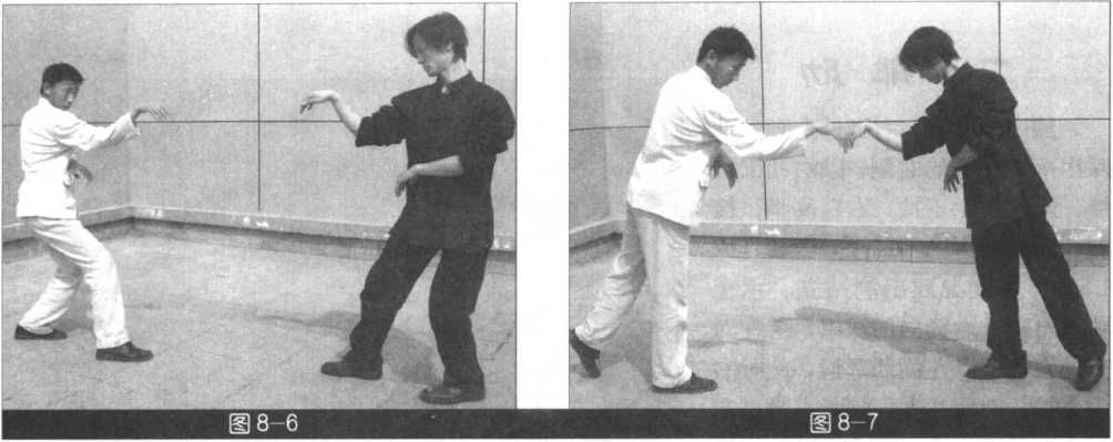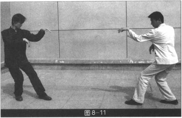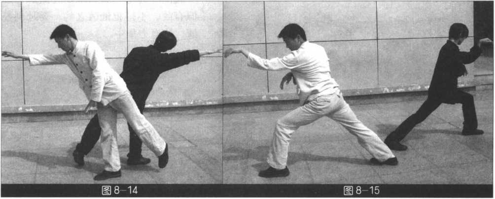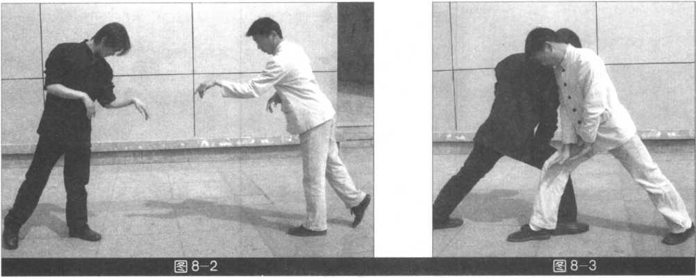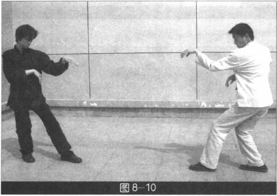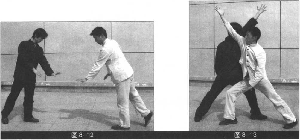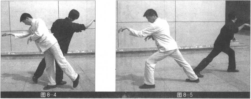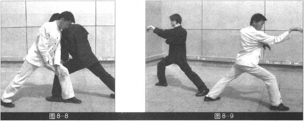 熊出洞站立,右脚过左脚向前踩出落 在对方的右侧,以右肩部相撞。接着左脚 过右脚向前踩下,右转身180°成右侧身 熊出洞站立。乘上式,左脚过右脚向前踩 出,落于对方左侧,以左肩相撞,右脚过 左脚向前踩出,左转身180°恢复开始时 的姿势(图8—1?10)。【注意事项】肩部相撞时要呼气, 对排后上步转身要快,训练时应当与 实战同等对待,做到练功时面前无敌 似有敌,不得犯懒散之病,要时刻警 醒,注意力集中。