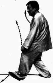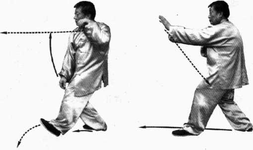 左脚猛向前蹬,催出右脚,中节腰、肩、胯由腿部蹬劲的力量 疾速左旋催出右手。右手与右足同时到位。出手要快,力达掌根, 手发出的力距要远。意念并不是把手伸出去为目的,而是要击中 数丈之外的目标。要求整个动作要快,发力要猛,意念要远。这样 长期练习,不但能发出很大的爆发弹性力,而且力的渗透性强, 威力大。