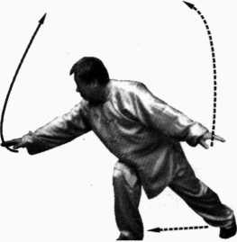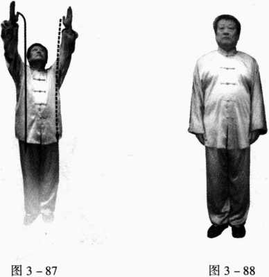 第一动身体向右旋180。,右手向右平伸划弧,身体重心移至右腿; 目随手变,成吸气状(图3-86)。第二动接上式,身体直立,左脚向右脚前靠拢;两手外旋至两手心 向上,然后双臂由两侧上抬至两肩上方,两手心相对,手指朝上;目视双手间,为吸气状(图 3-87)。此动和上动同时为 过渡动作,意想两手收天地 之灵气。第三动接上式,双手变掌心朝 下,并同时经胸前向下按至 小腹前,停顿几秒钟后,两 手自然分开垂于身体两侧; 目内视丹田,成呼气状(图3 - 88)°此动意想两手收天 图3.86地之灵气后随两手下落,沉于丹田。国木丛书