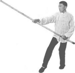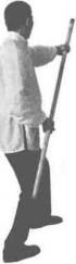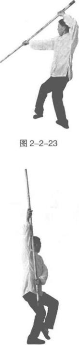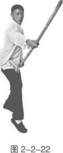 (图2-2-26、图2-2-27)。以右脚为轴向左转身,同时左脚提起,随身体的旋转双手持棍将棍头朝下向左侧划圆扫击右手在下(图2-2-28)