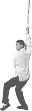 擎天式起。左脚先向前踩落一小步紧接着右脚再过左脚向前踩落一步同时双手持棍由上而下进行劈击右手在前(图2-2-21图2-2-22)。以右脚为轴向右转身同时双手持棍由下向上撩起右手在前(图2-2-23)。棍尾向下劈落后变为擎天式(图2-2-24、图2-2-25)重复前面的单式练习即可。