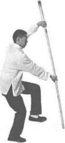 朝天式起。左脚先向前踩落一小步紧接着右脚再过左脚,向前踩落一步同时双手持棍由上而下进行劈击右手在前