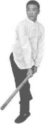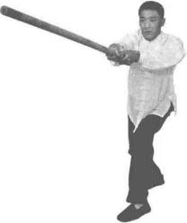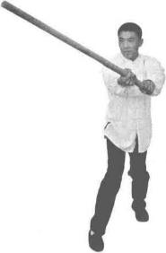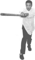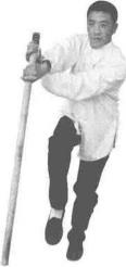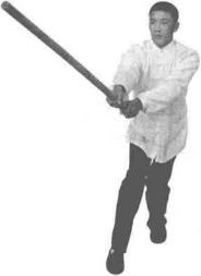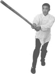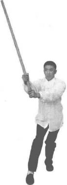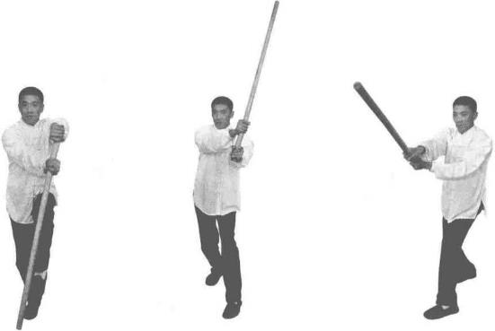 双手持棍成四平式。右腿提起同时双手持棍棍头朝下向右侧横拨并有上提之力(图3-1-38、图3-1-39)。紧接着右脚向前踩出一步脚尖着地内扣15。左脚在后紧随半步同时双手持棍由下向右上方划圆横拨(图3-1-40)。紧接着,再向左下侧斜劈。(图3-1-41)
