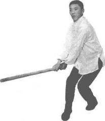 承上势。左脚提起同时双手持棍棍头朝下向左侧横拨并有上提之力(图3-12)。紧接着左脚向前踩出一步脚尖着地,内扣15。右脚在后紧随半步。同时双手持棍由下向上方左侧划