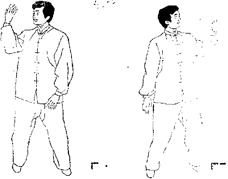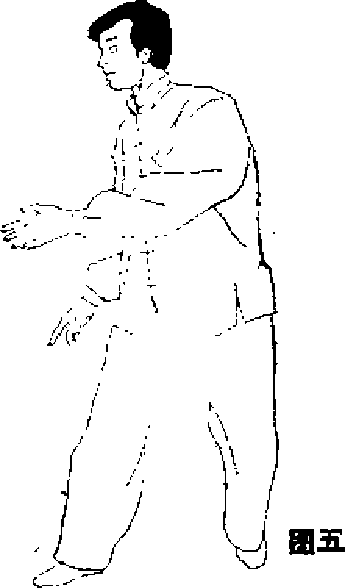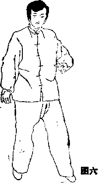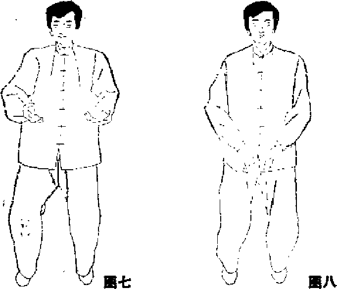 (3)定步搅海是在分鬃式的基础上进行右手从右胯偏后下方向前摆拢拢到小腹前在左手向前摆拢的同时,右手顺小腹前向右胯的下侧后拢(如图五)手当右手乂从右胯后侧向前摆拢时左手顺小腹前向左胯的下侧后摆(如图六)就这样两手一前一后、一左一右的来回摆拢两侧共摆六次。手摆向哪侧,身体就向哪侧脩步身体倾向哪侧哪的腿脚为实另一侧则为虚口然后抱元养气还原收功(如图七、图八3