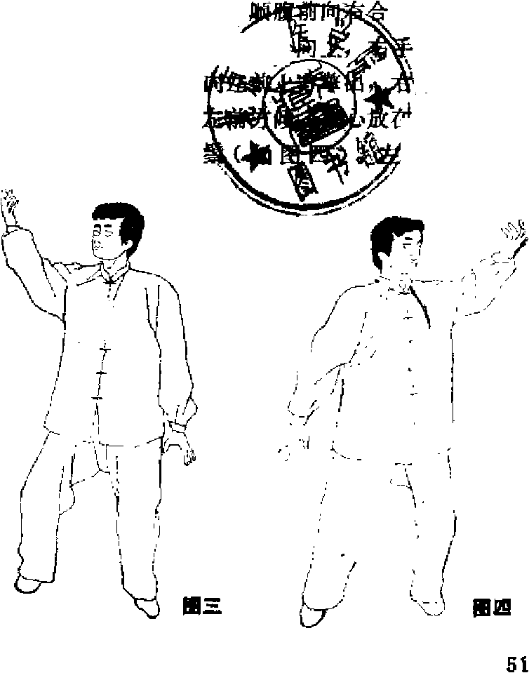 (如图三)然后左手从左胯身体向右副俯转?左手在阴枭口下两手相合,左手斜向