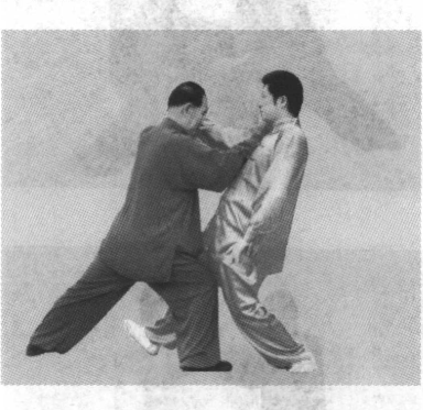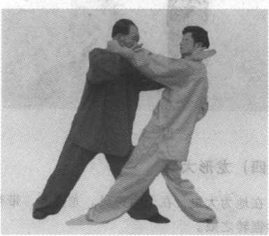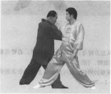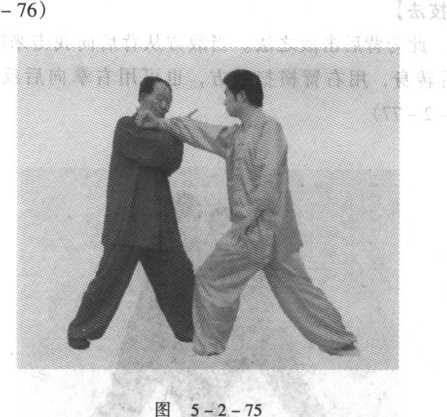 4, 也可在敌方右拳打来时,我左手向我右方拨开敌手 (图5-2-75),这时敌方处于背势,我可前插右脚,用右臂 插进敌方腰、腹部,拧腰转胯,施展龙形裹横将敌方拨倒。