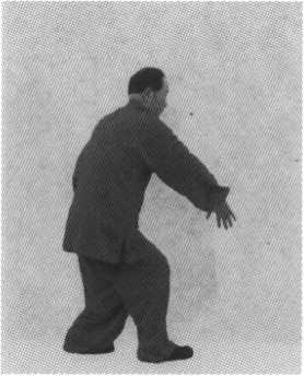 接上式。身体左转,右脚向右前进一步,脚落地后屈膝, 五趾抓地,脚心含空;左脚立即跟上,用膝盖顶近右膝弯内 处,两腿均屈曲成左鸡步。在转身的同时,左掌掌心向内,五 指撞开向下,虎口向右前方,用掌跟往外撩击;同时,右掌也 掌心向内,五指撞开向下,虎口向前,用掌往右胯处后捋,掌 根有往右外方撩击之势,肘尖有后顶击之势。两虎口相对,两 手小指均向外。头顶项竖,下颌里收,闭唇叩齿,舌顶上腭。 眼往左前方视去。(图5-4-8)