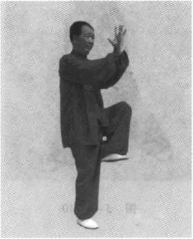 【要点】 此势由前势相变,两手有内抱之意,劲法有由 展而缩,为合劲。提膝上贯,有独立之势。全身上下垂直,不 偏不倚。两掌竖起,两臂不能挺直,肘尖下垂。上贯的膝部要 膝尖向上,脚掌要平。