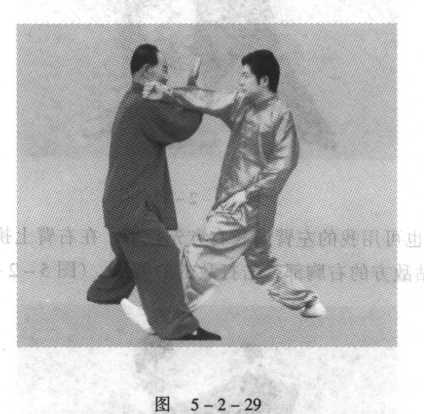 1.敌如用右拳打我上节,我以左手采敌右腕,拧转敌方 手臂,并以我右肱上弦托挎敌方上臂阴面。(图5-2-29)
