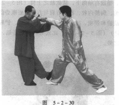 2,也可以以我的右手拨开敌来手,同时用左脚使刮地 风腿铲踢敌足胫骨。左掌顺势下塌(图5-2-30),以防敌 方之拳脚来袭我小腹或阴部。此式或拨或撩或踩,均可随意使 用O
