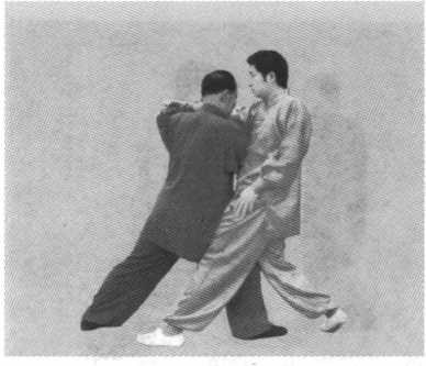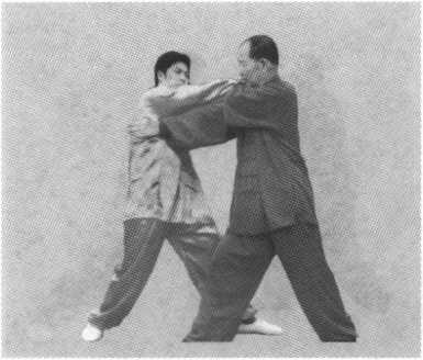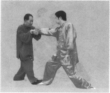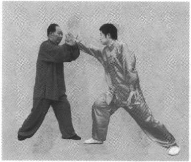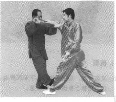 挑者,向上打起也;领者,牵引也。此为心意拳的牵引下 拽之劲。也有人把领字写成翎,恐怕是认为人的领子不可挑, 才有此误。此领并不是挑敌方的领子,而是在上挑敌臂的同 时,也可顺势拽敌人的身体手臂。