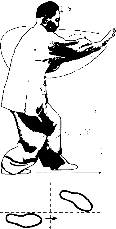 盘练法:以轻步站开始。左手 左脚在前;左足上前一步,落地后 五趾抓地,足心含空;左臂曲肘,左 掌由左胯前往右,再经右肩部往左 划圆;在划拨时右掌从右胯上起, 掌心向内,五指自然撞开向前,在 右胸前也划一小圆,当与左肘相遇 时,以右虎口卡住左肘部,助左肘 往左前方推击去。右足跟上,全掌 落地,五趾抓地,足心含空,右膝顶