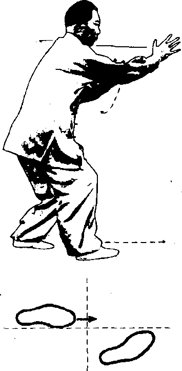 盘练法:以轻步站开始。左手左足在前;左足上前半步, 、五趾抓地,足心含空;上身沉肩坠肘,含胸拔背。左掌五指措 开,掌心向右,手掌自左往右划拨去;再上右步,右掌也五指楂