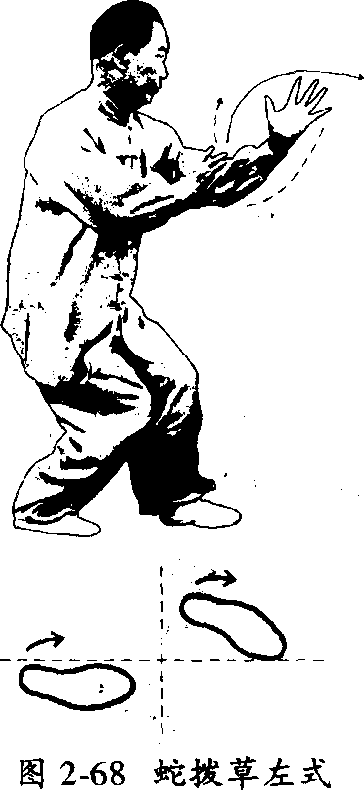 左,往左肘部划去;当两掌相会在 左胸前时,左足前进一步,左足落 地、五趾抓地后,右足立即跟上,扣 裆合股,两腿合力,谷道上提,成左 鸡步。在左足落地的同时,左掌掌 心向右,五指指开向前,从右肘下 向左前方穿出。要沉肩坠肘,以身 发力,肩摧肘,肘摧手;要有螺旋 力,穿击要有抖弹力Q在左掌穿击 出的同时,右掌往后捋,捋到左肘 处助力。头顶项竖,下须内收,闭口 扣齿,.舌顶上腭;眼从左掌虎口前 视,成蛇拨草左式。(图2.68)