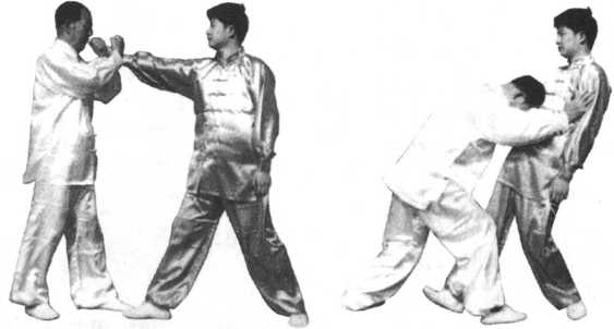 3.若对方用左拳向我击来时,我先抱臂顾住,再用右手拨 开对方的左手,左手拨开对方的右手,对方胸前空虚,我用头击 对方的胸部(同图5 -69、图5-70),惟图形相反。