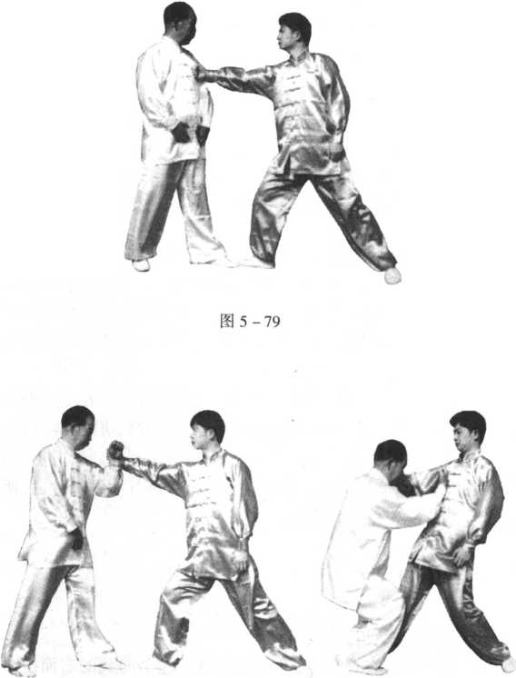 2 .当对方用右拳向我击来时(图5-79),我用左手外拨对 方之手(图5-80),屈右臂成肘,从对方的下腹部一直往上钻击 对方(图5-81)。