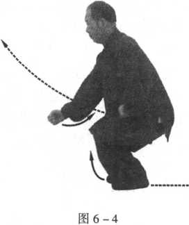 接上式,左足先上前一 步,落地后五趾抓地,足心含 空;右足上前一步,与左足并 在一起,脚掌落地后五趾抓 地,足心含空;在左足上步的 同时,左掌由掌变拳,从上往 下捋到左胯部,拳眼向上;右 掌也由右额前上方变拳,然 后由上向下顺右膝盖向前钻 击,一直钻到右膝前,拳心向 左,拳眼向上;全身成并步下 蹲式,头顶项竖,下须内收,闭口叩齿,舌顶上腭,眼往前方视去 (图 6-4)。