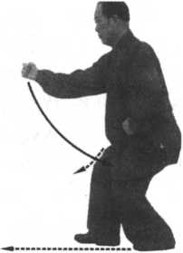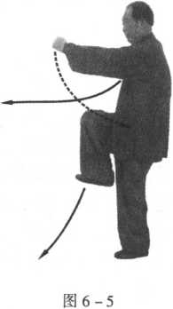 接上式,左足向后退半步,左腿 站立成独立式,右腿向上屈膝提足; 在左足退步的同时,左拳由左胯处 向前突然直击出,拳眼向上,拳心向 右方;而右拳在提右膝的同时由右 前方急速回抽到右胯旁护胯,左拳 向前方穿出,要沉肩坠肘,含胸拔 背;头顶项竖,下须内收,闭口叩齿, 舌顶上腭,眼向左拳前方视去(图 6-5)o图6-6劲意图6-6此式为退步寸劲的练法。即退左步,左拳前击;提右膝,右拳 后拧,然后变成后抽落下,左拳前钻拧进。