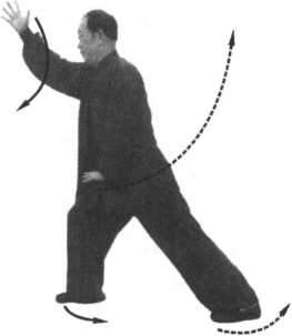 图 6 - 18接上式,左足立在原处不 动;右足向右前方跨出一步, 屈膝成右隼柱步,全脚掌落 地,五趾抓地,足心含空;在右 足前跨的同时,右掌从后下插 经裆内顺右脚、右膝往右前上 方一直挑起,就像地球上有一 铁环被我抓住拎起来一样,这 就是心意拳“恨地无环”的劲 意。这时,五指叉开向前,掌心向左方;左足在右足进步的同时, 全掌撑地,作为支撑点;左掌在右臂上挑的同时从右肋旁顺右胸 部往下按捋,一直按到裆前停住护裆,掌心向下,五指叉开向右 前方;头顶项竖,下额内收,闭口叩齿,舌顶上腭,眼视右前方(图 6 —18) o