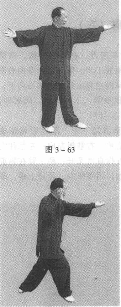 ① 接前势。身体继续右转,面向正南方,重心后移。左脚不 动,右腿微屈。左掌翻掌,掌心向上,虎口在左,五指自然叉开 向前;右臂向后划弧,掌心向上,虎口在右,五指自然叉开向 后。眼随左手前视去。(图3-63)