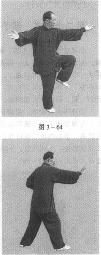 ② 身体微向左转。左腿提膝上贯;右腿支撑成右独立势。两 手不动。眼向左手前方视去。(图3-64)
