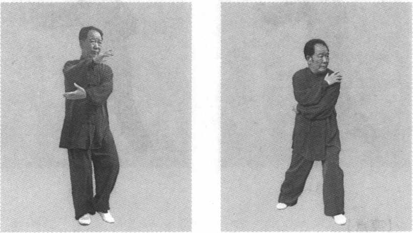 此式两手要抱身,两肘要贴肋,形成十字剪手全身捆绑势, 是心意太极拳的裹缩劲。